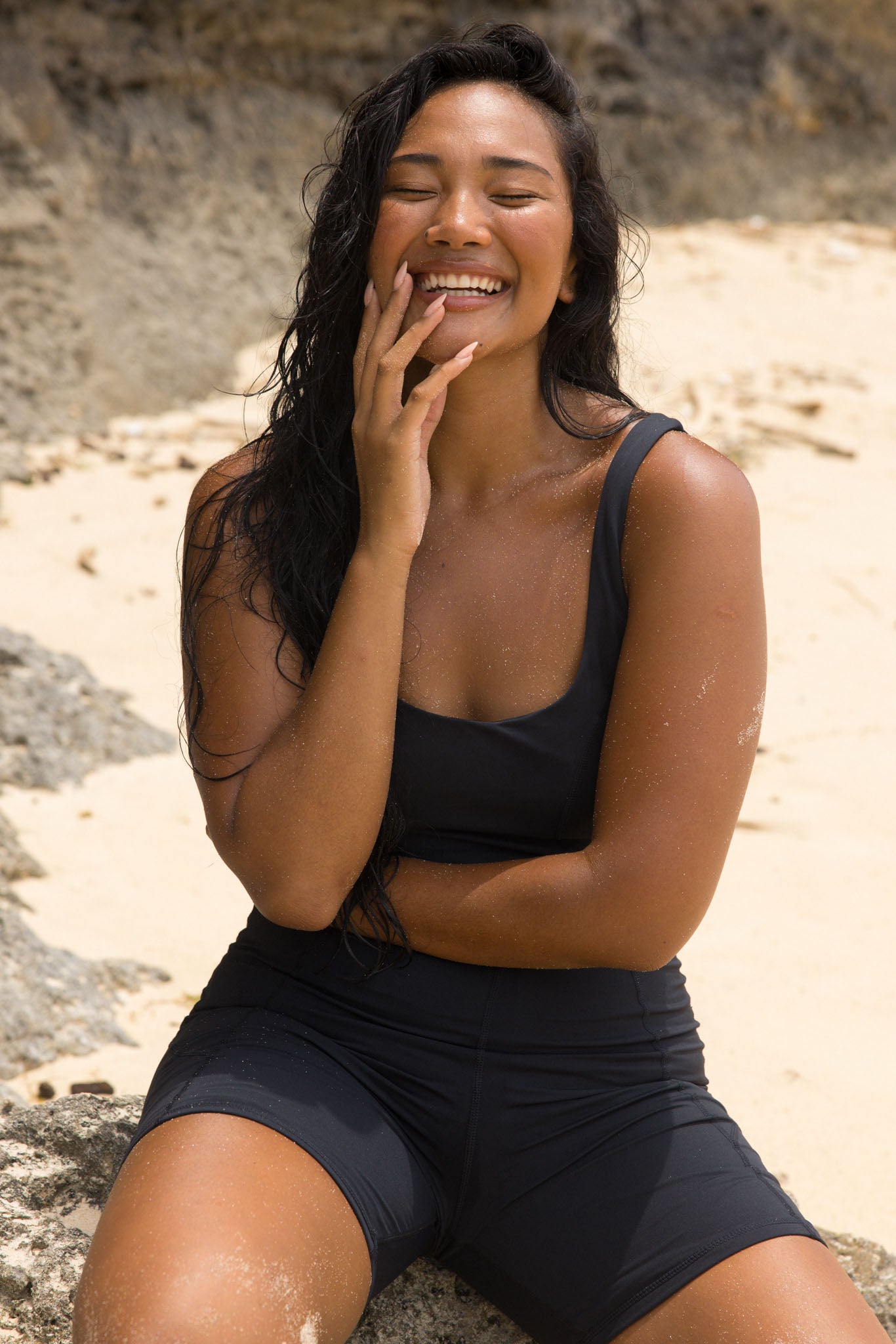 Or our Ash Cropped Vest paired with our Alyssa Mid Swim Short and you’re good to go from Pilates to work calls to school pick-up and beyond.