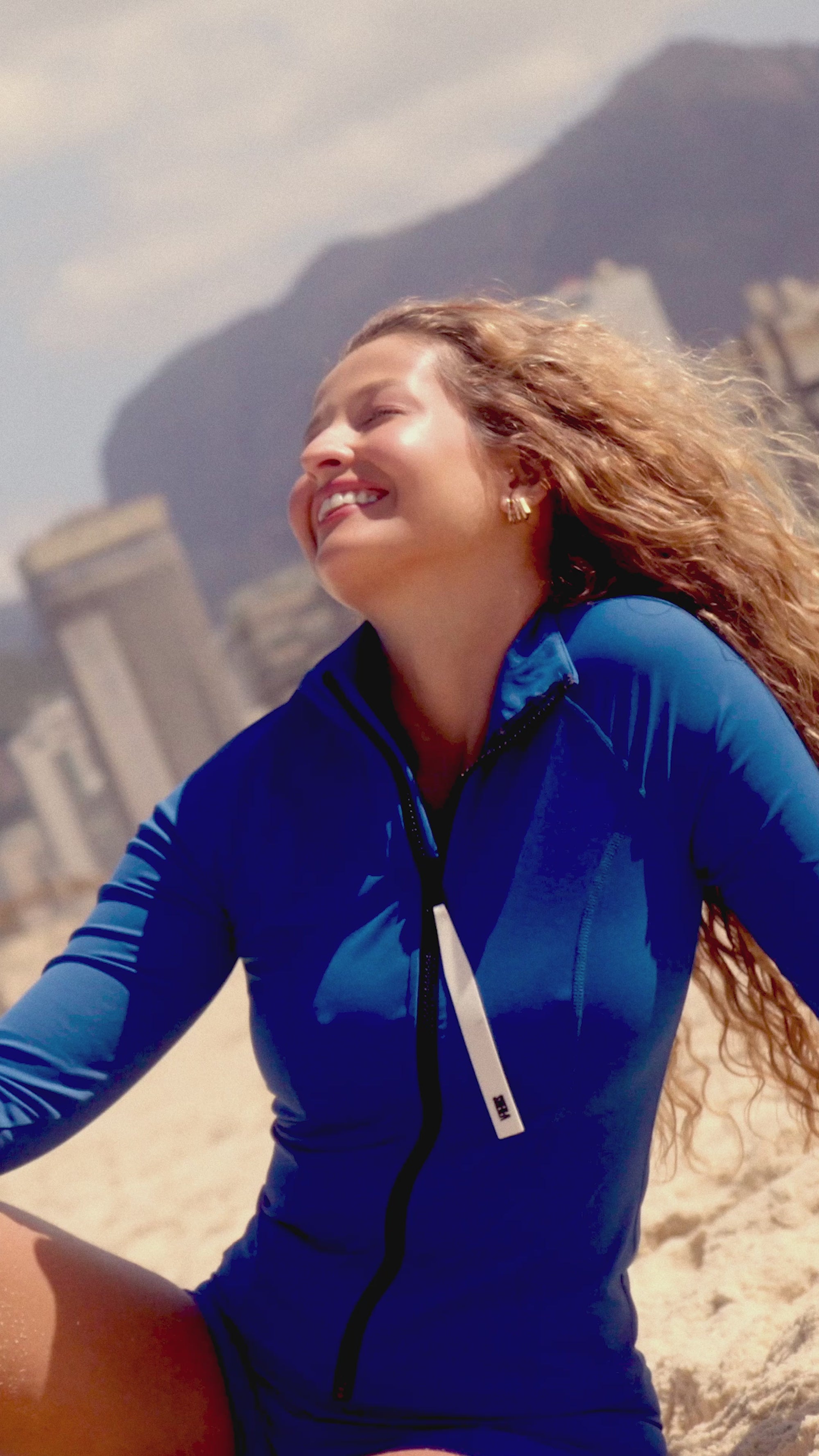 I've been looking for a zip-front rashie that gives me full coverage for ages and was so glad to see this piece appear in my feed. I love the high neck and that the fabric is UPF50+. Also love the thumb holes. The Sheila branded zipper tag is a stylish addition and makes this feel more designer than a lot of other rashies on the market. I wear this in and out of the water — while the fabric is supportive and thick, it's breathable and doesn't make me feel hot in the full sun. The fit is firm so if you have a large bust or are between sizes, I'd recommend sizing up. The quality is top notch and it's worth the investment.